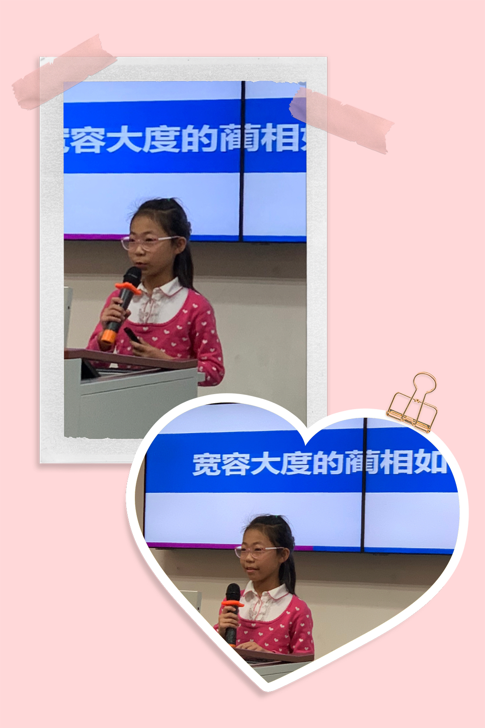 五年六班刘佳欣同学为大家带来脍炙人口的《沁园春雪》。分别从创作背景、词韵形式、诗词解析等几方面分析讲述,把大家带到长城内外,冰封雪盖的壮丽景色之中,让大家领略到这首词旷达磅礴的意境,也感受到一代伟人毛泽东的豪放胸襟。