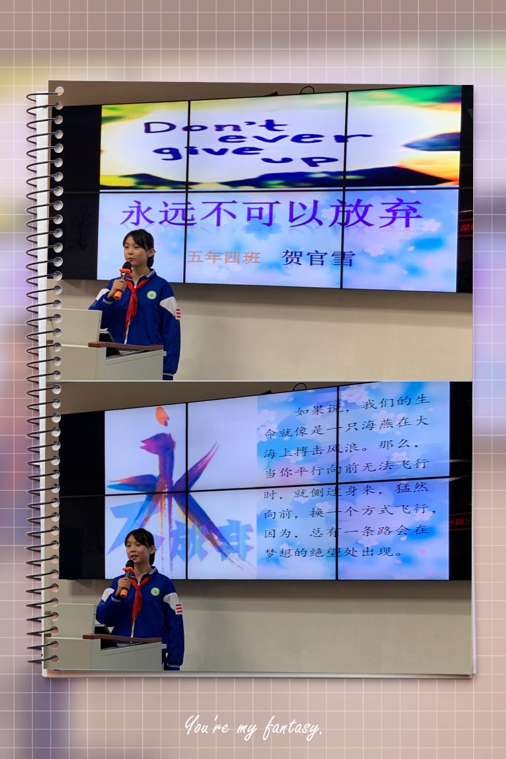 五年四班贺官雪同学带来的是《永远不可以放弃》。把着眼点放在科技、体育等领域的名人事迹上,动情地讲述这些人为了追求理想,为了祖国富强,克服重重困难,尝遍艰辛,绝不放弃,最终成功的故事。向观众传递了为理想,为国家永不放弃的信念。