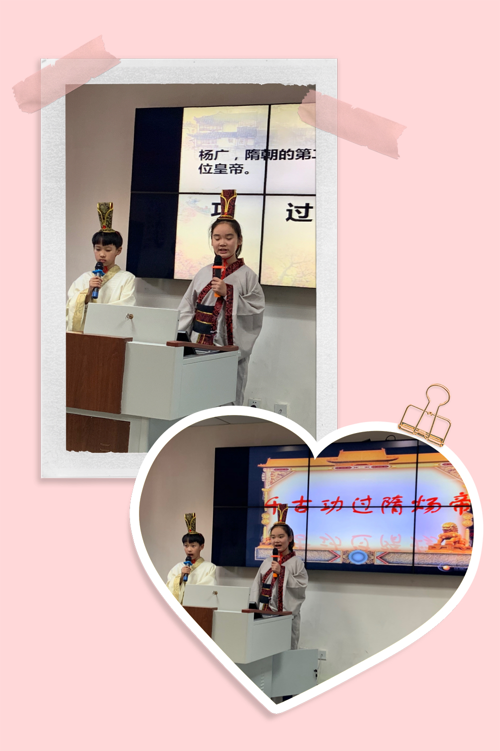 六年二班矫程来同学和杨曜泽同学分享《千古功过隋炀帝》,从工业大、精力好、才情美几方面有理有据分析隋炀帝功过两面,修葺京杭大运河。(划红线有问题,什么是工业大?另外这几方面都是功,没有过啊。最后一句还没写完)