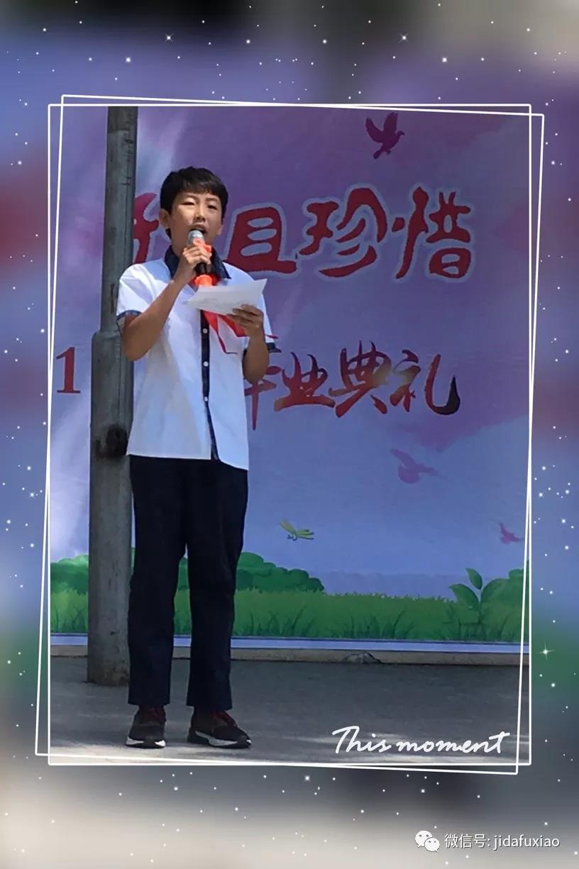 聆听着校长的讲话,同学们倍感温暖,同时激发了勇往直前的勇气,树立了追求卓越的信心。六年七班金北辰作为学生代表,表达了同学们对学校,对校长,对老师的感谢和祝福,并立下誓言要把取得的新成绩写在母校的荣誉墙上。